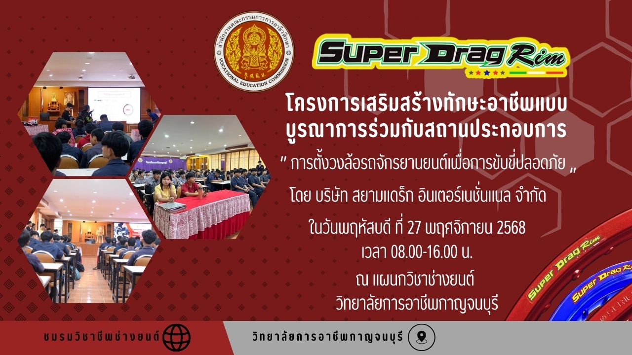 โครงการเสริมสร้างทักษะอาชีพแบบบูรณาการร่วมกับสถานประกอบการ"การตั้งวงล้อรถจักรยานยนต์เพื่อการขับขี่ปลอดภัย"โดยบริษัท สยามแดร็ก อินเตอร์เนชั่นแนล จำกัด วันพฤหัสบดีที่ 27 พฤศจิกายน 2568 เวลา 8:00-16:00 น ณ แผนกวิชาช่างยนต์ วิทยาลัยการอาชีพกาญจนบุรี