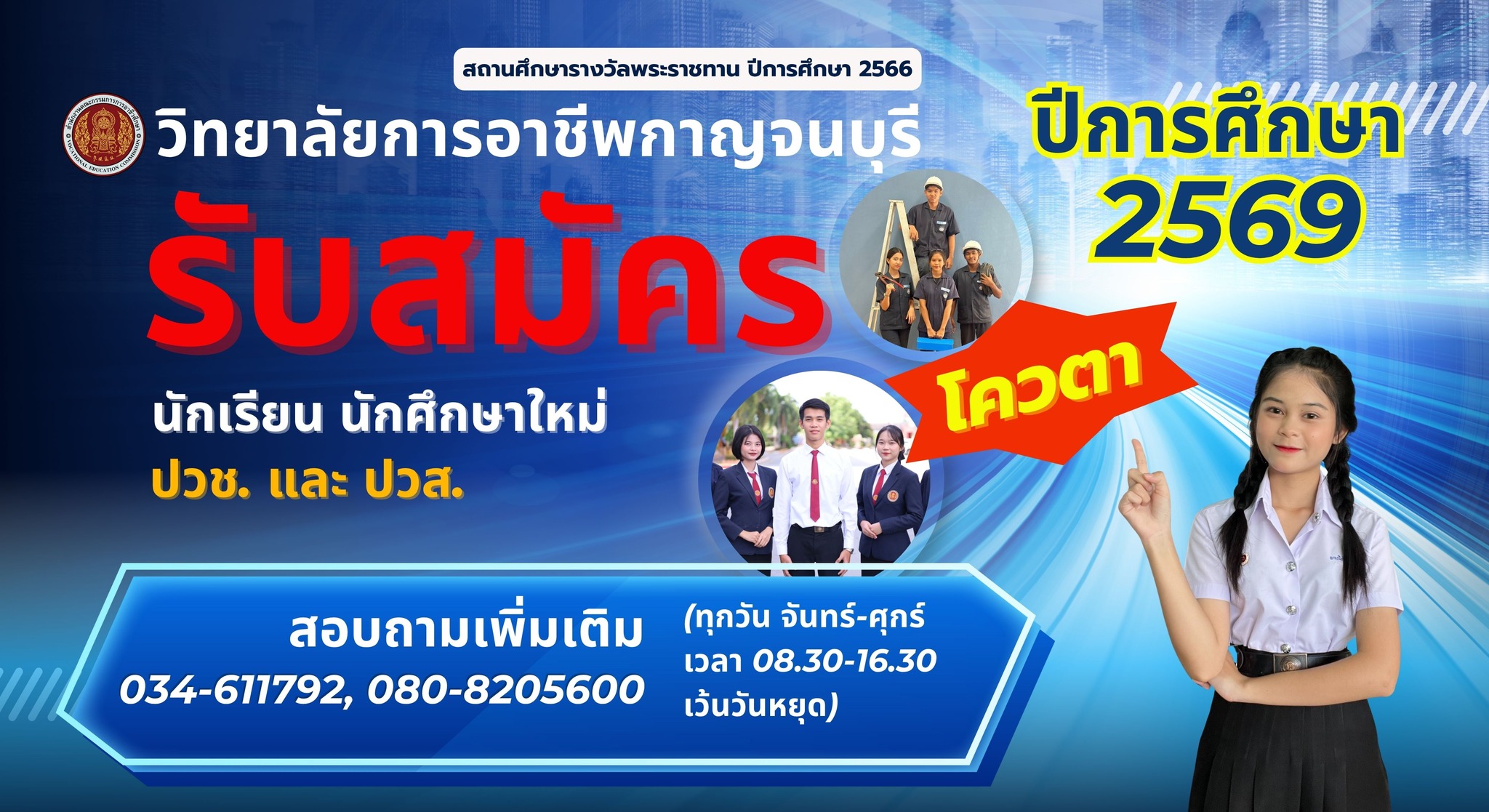 วิทยาลัยการอาชีพกาญจนบุรี รับสมัครนักเรียน นักศึกษาใหม่ ปวช. และ ปวส.ปีการศึกษา 2569สอบถามเพิ่มเติม 034-611792, 080-8205600(ทุกวัน จันทร์-ศุกร์ เวลา 08.30-16.30 เว้นวันหยุดราชการ)